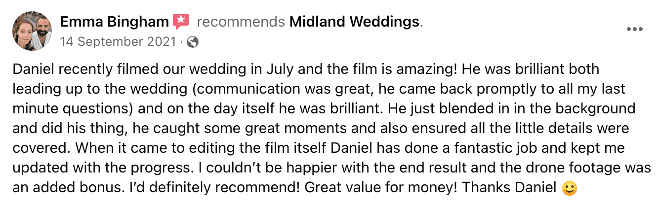 If you want to see some of my work, you can check out my portfolio of wedding videos and wedding photos on my website. You can also read some of the reviews from my happy clients below.